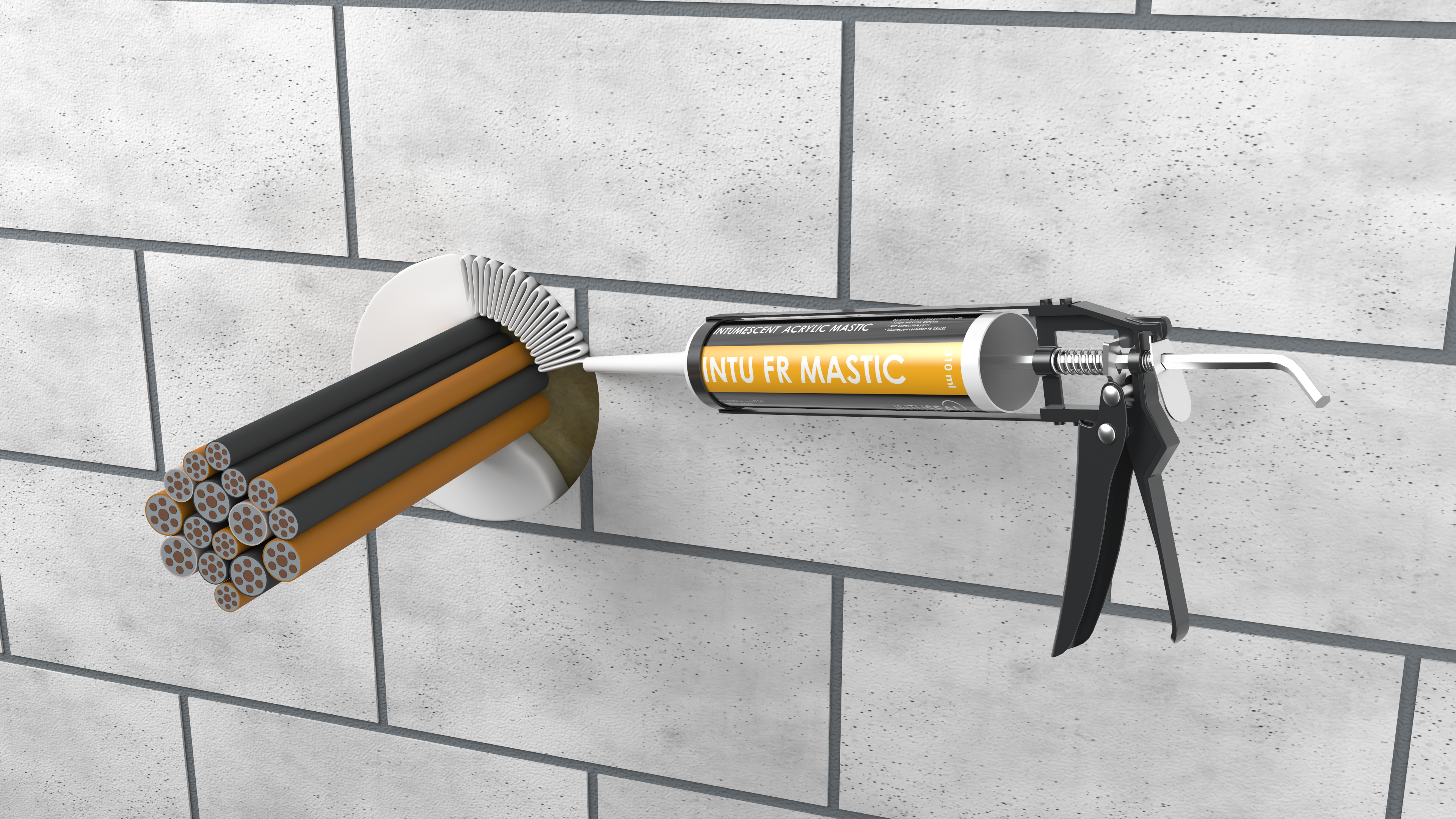 Az INTU FR MASTIC egy akril massza, amelyet úgy terveztek, hogy megakadályozza a tűz, a füst és a gázok terjedését a tűzgátló falak és födémek nyílásain keresztül. Az INTU FR MASTIC tűz hatására kitágul, és a csövek, kábelek és rések, tágulási hézagok körüli nyílásokat lezárja azáltal, hogy a tűz, a füst és a gázok számára szoros gátat képez.